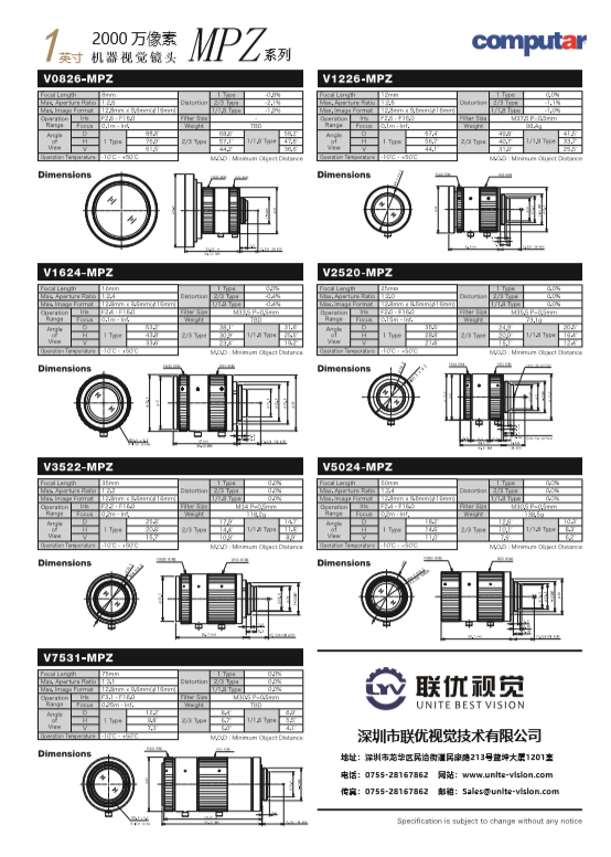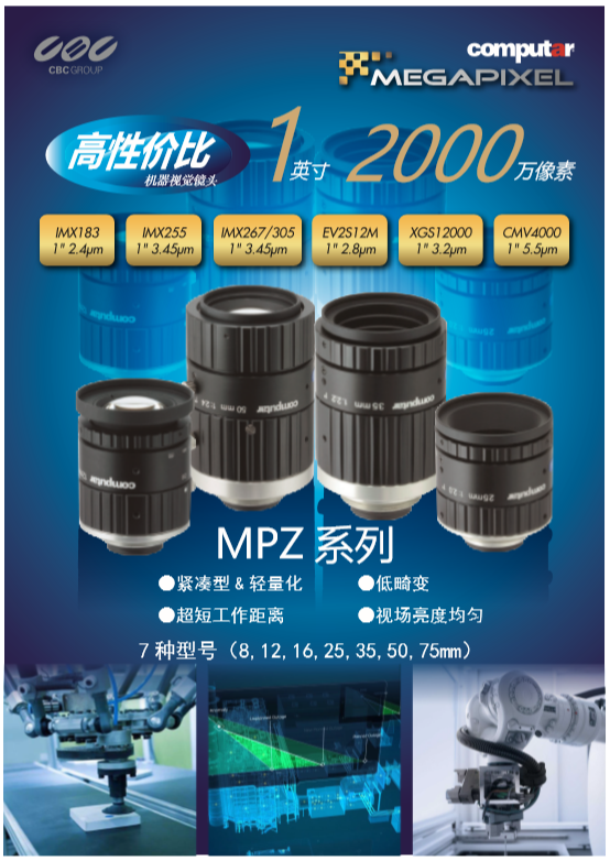 日本CBC旗下Computar鏡頭發布新款MPZ系列機器視覺鏡頭,該款鏡頭最大支持1英寸靶面同時具有2000萬像素,共有7款型號選擇(8mm、12mm、16mm、25mm、35mm、50mm、75mm),在外觀及功能上具有緊湊型&輕量化、低畸變、超短工作距離、視場亮度均勻等特征,匹配在IMX183、IMX255、IMX267/305、EV2S12M、XGS12000、CMV4000等芯片上,適用范圍:機器視覺、工業自動化,智能交通,道路監控等。
