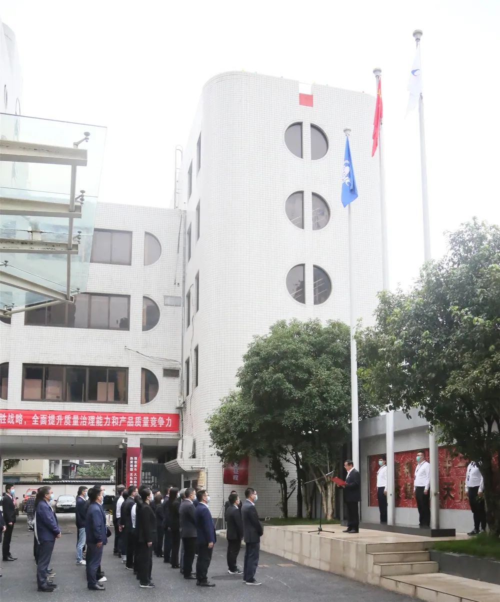 伴隨著雄壯的國歌,鮮艷的五星紅旗冉冉升起,隨著激昂的航天科工之歌,集團公司司旗飄揚空中。參加升旗儀式的全體干部職工莊嚴肅立,行注目禮。