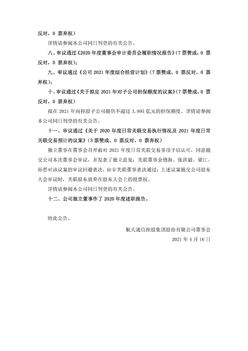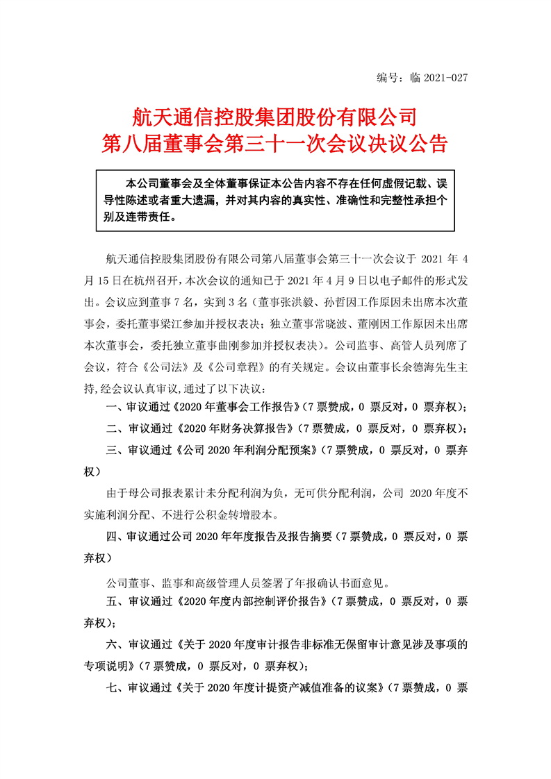 航天通信控股集團股份有限公司八屆三十一次董事會決議公告