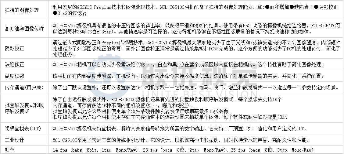 ●XCL-CG510C(彩色)結合了索尼技術的優點,具有較高的色彩還原度,在工業視覺和非制造視覺市場中都得到了優化。