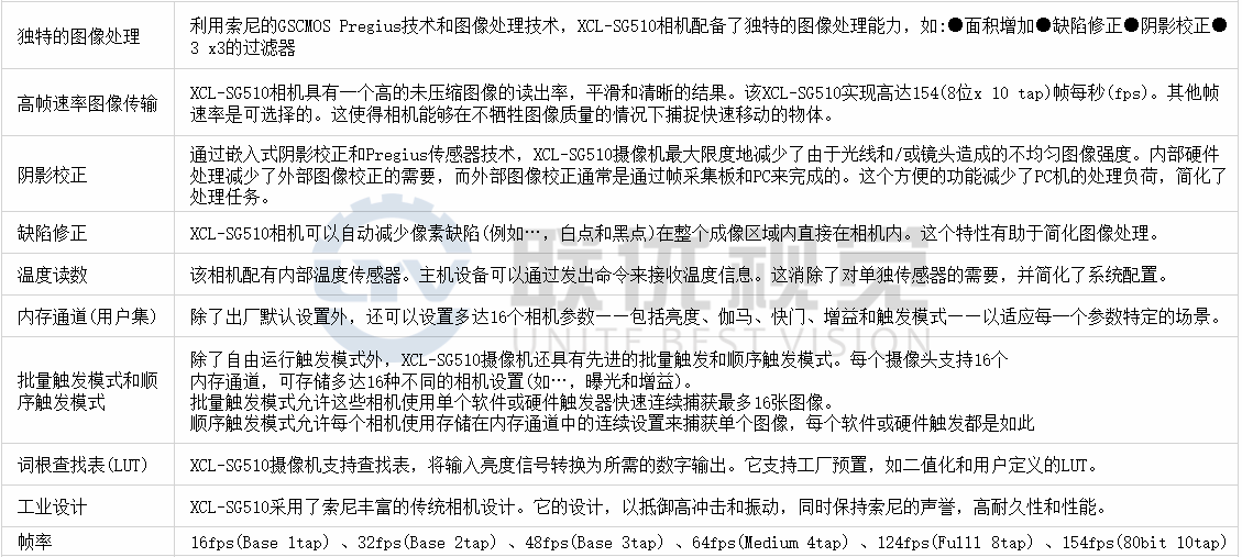 ●該XCL-SG510(黑白)結合了索尼技術的最佳在一個方便的形式因素,這是優化的工業視覺和非制造的視覺市場使用。