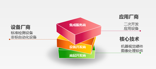機(jī)器視覺產(chǎn)業(yè)鏈可以分為底層開發(fā)商(視覺光源、工業(yè)鏡頭、工業(yè)相機(jī)、圖像采集卡、圖像處理軟件等)、設(shè)備開發(fā)商(測(cè)量設(shè)備和非標(biāo)檢測(cè)自動(dòng)化專機(jī)等)和集成服務(wù)商(二次開發(fā)),其中底層圖像處理軟件是最核心壁壘。目前國(guó)內(nèi)機(jī)器視覺行業(yè)中底層軟件、高端工業(yè)鏡頭以及高端工業(yè)相機(jī)領(lǐng)域還基本被國(guó)外品牌壟斷,低端鏡頭和工業(yè)相機(jī)領(lǐng)域逐漸有國(guó)產(chǎn)廠商涉及,視覺光源國(guó)內(nèi)競(jìng)爭(zhēng)比較激烈,系統(tǒng)集成和視覺專用設(shè)備發(fā)展迅速。